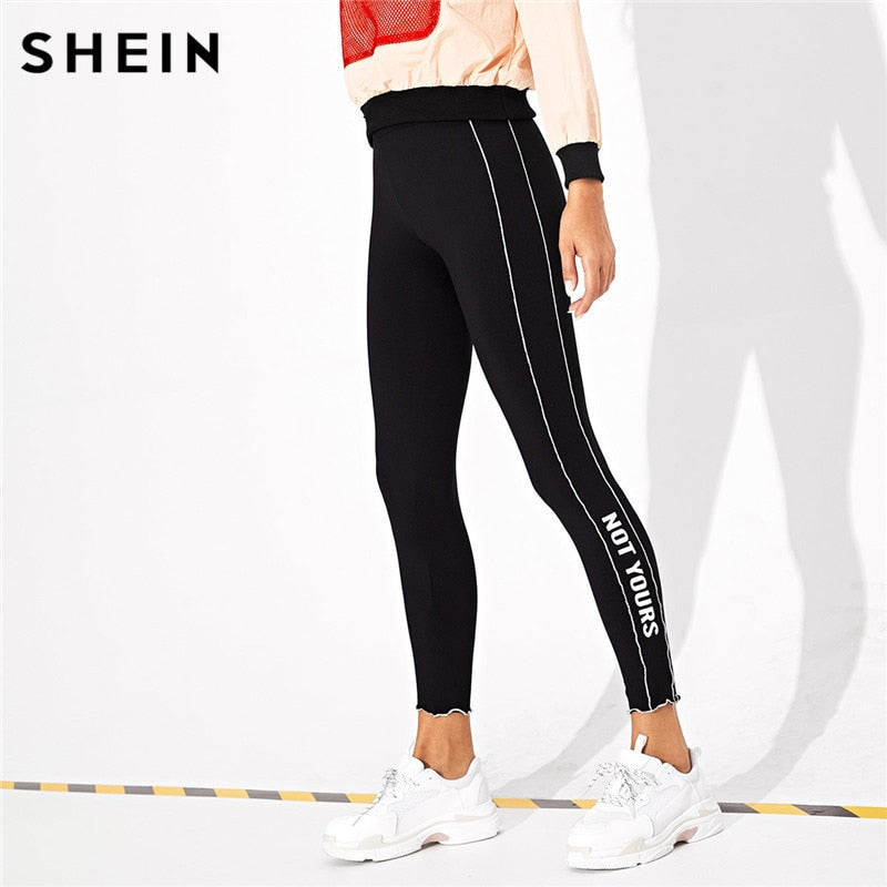 SHEIN Black Casual Solid Plain High Waist Crop Streetwear Leggings Autumn Leisure Modern  Lady Lettuce Trim Letter Women Legging