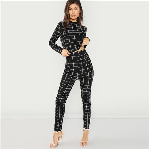 SHEIN BlackMock Neck Plaid Top & Pant Set Women Stand Collar Long Sleeve  Elegant Two Pieces Sets 2018 Spring Plain Twopiece