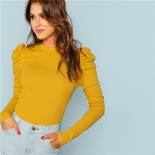 SHEIN Mustard Elegant Minimalist Puff Sleeve Rib Knit Solid Pullovers Slim Fit Tee 2018 Autumn Office Lady Women T-shirt Top