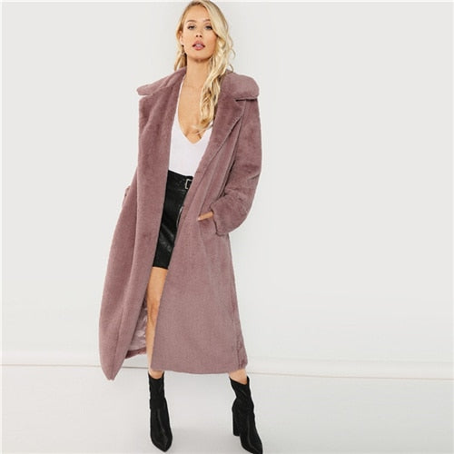 SHEIN Pink Office Lady Elegant Open Front Longline Faux Fur Teddy Solid Coat 2018 Autumn Minimalist Women Coats Outerwear