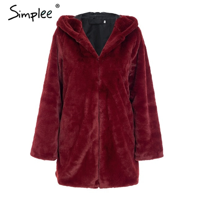 Simplee Elegant teddy bear furry women winter coat Faux Fur plush warm hair hooded fur coat Female shaggy plus size outwear coat